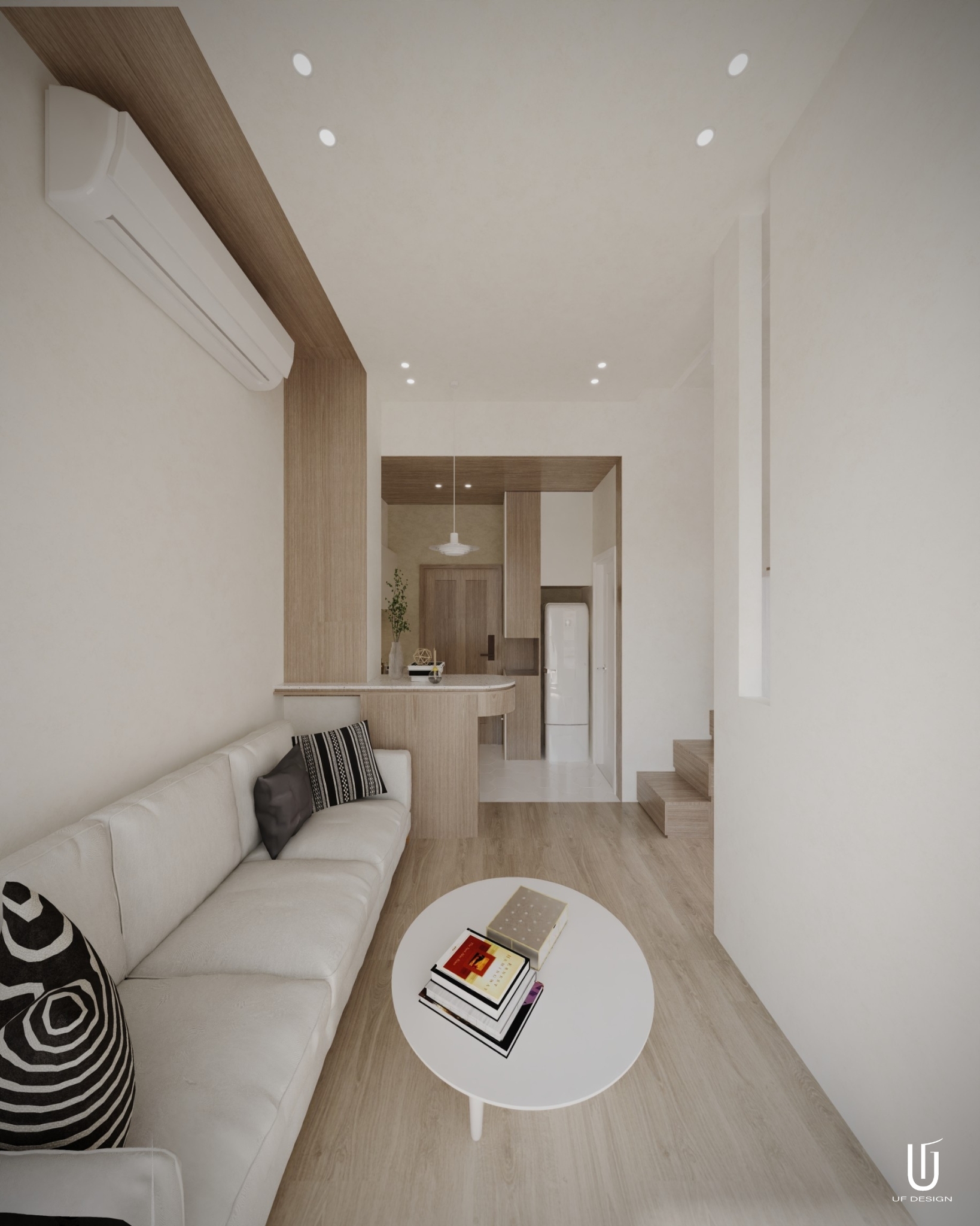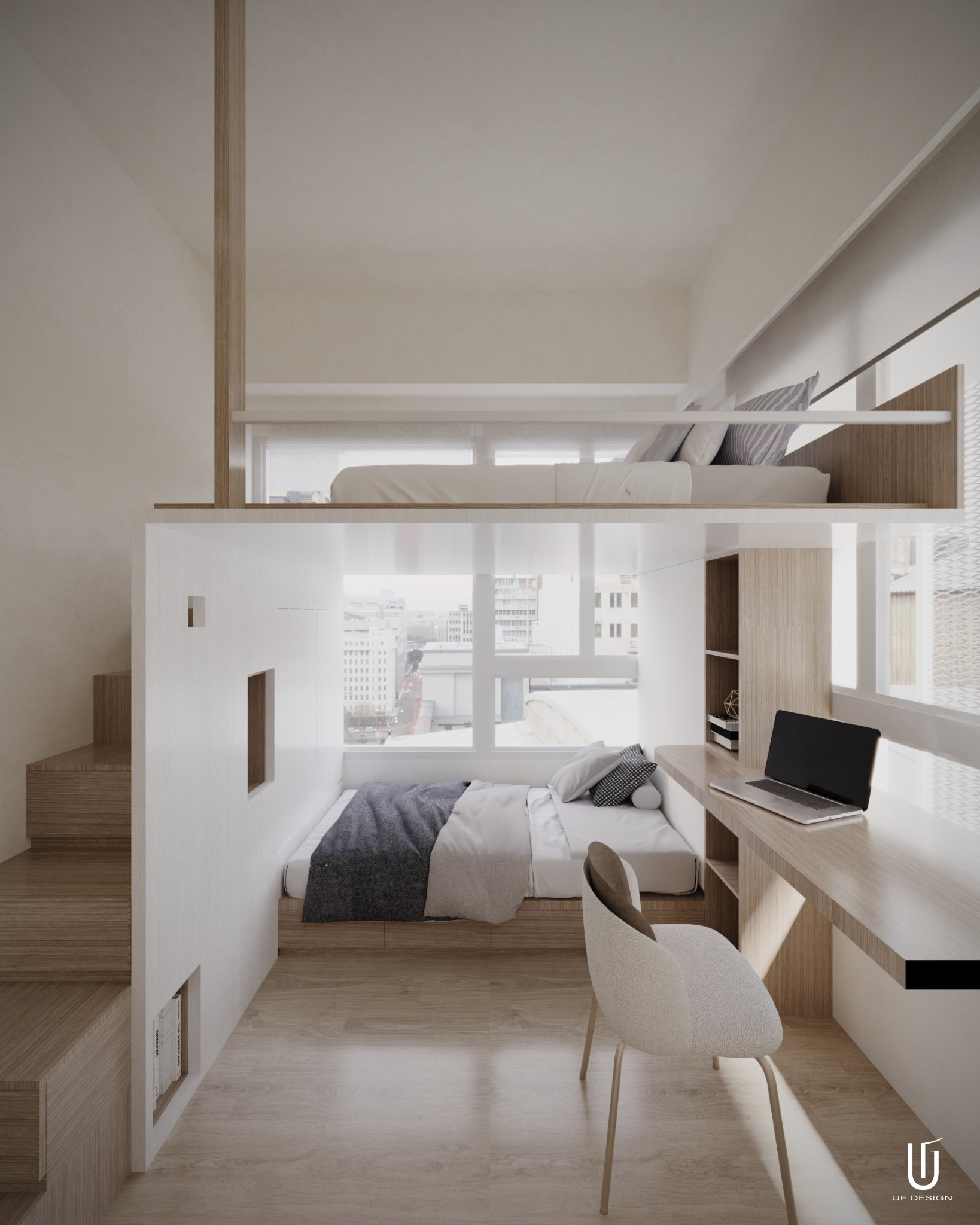 #聰明設計融合生活_適得其所的藝術在夾層的設計中,在一樓設計了溫馨的客廳與用餐小吧台,將日常生活的功能區域巧妙結合,不僅滿足了家庭成員的不同需求,也提升了居住品質。而臥房則採用上下型的分隔區域,讓使用空間再提升,也讓兩個領域的採光更全面,這些細節設計使得每一寸空間都充滿了生活的味道。通過這樣的規劃,夾層空間不再是讓人感到雞肋的地方,而是能成為探索空間可能性的轉捩點。