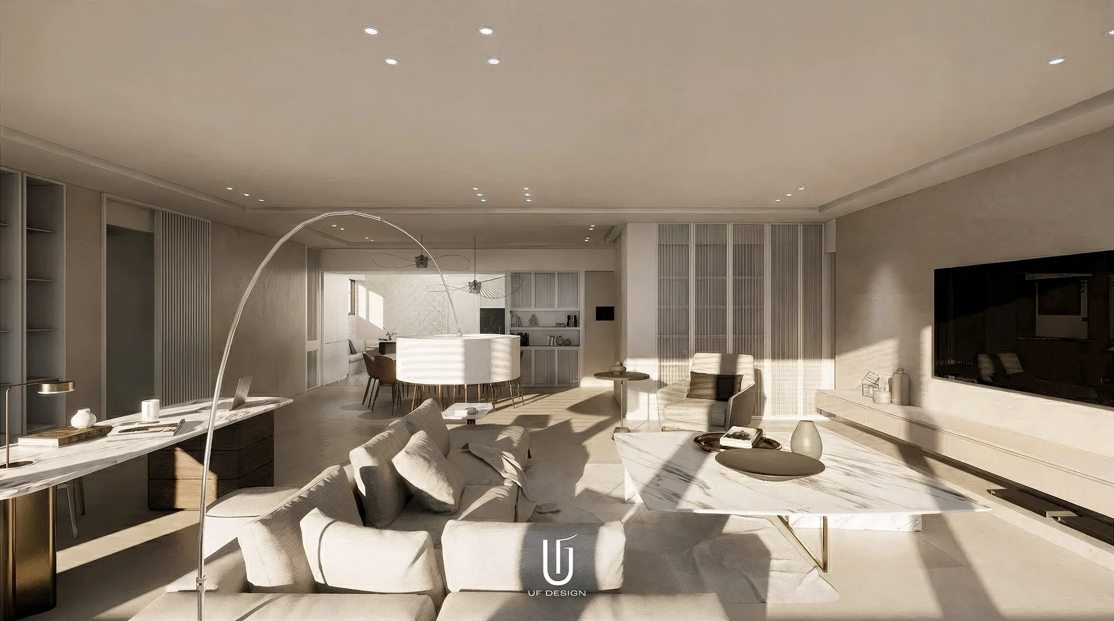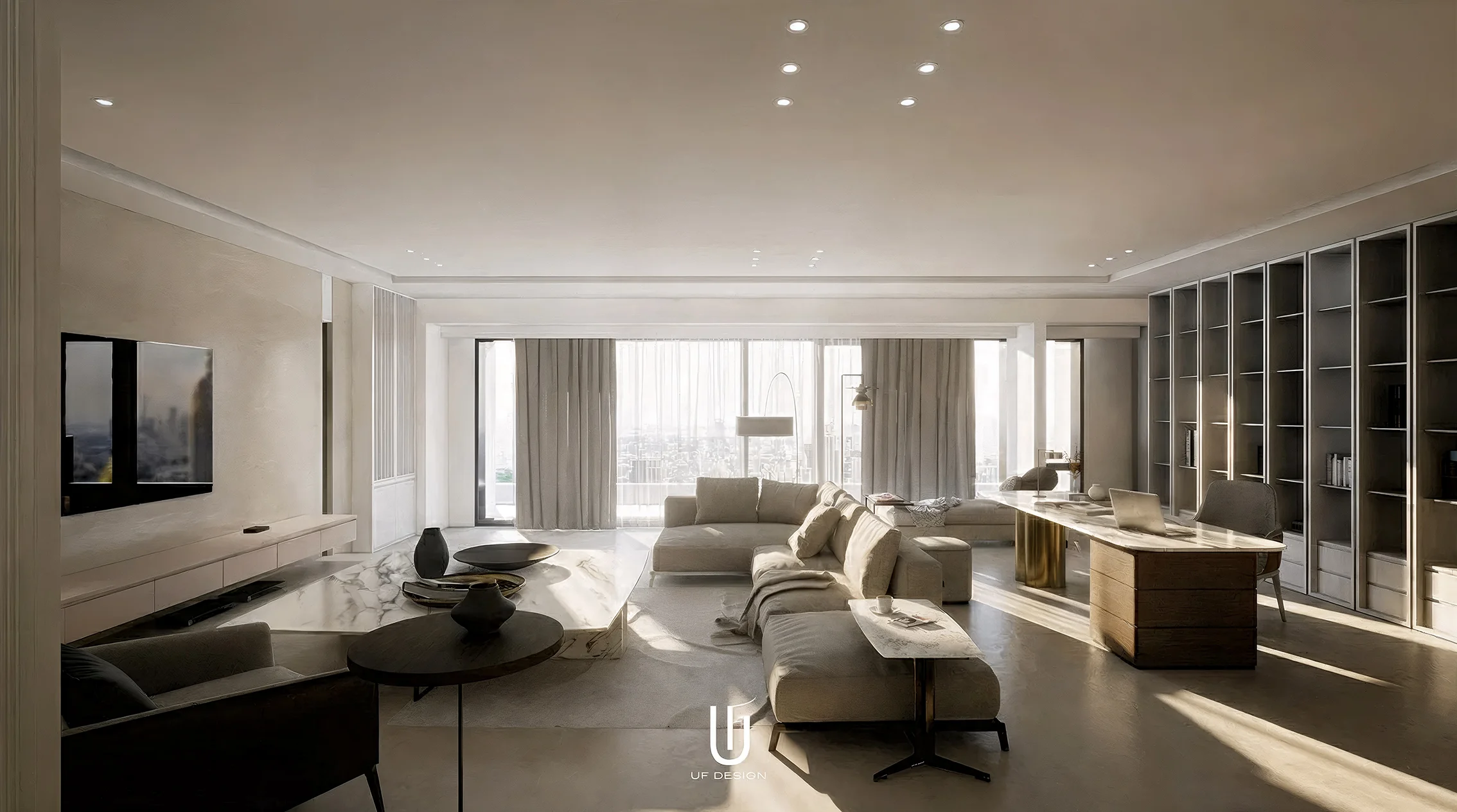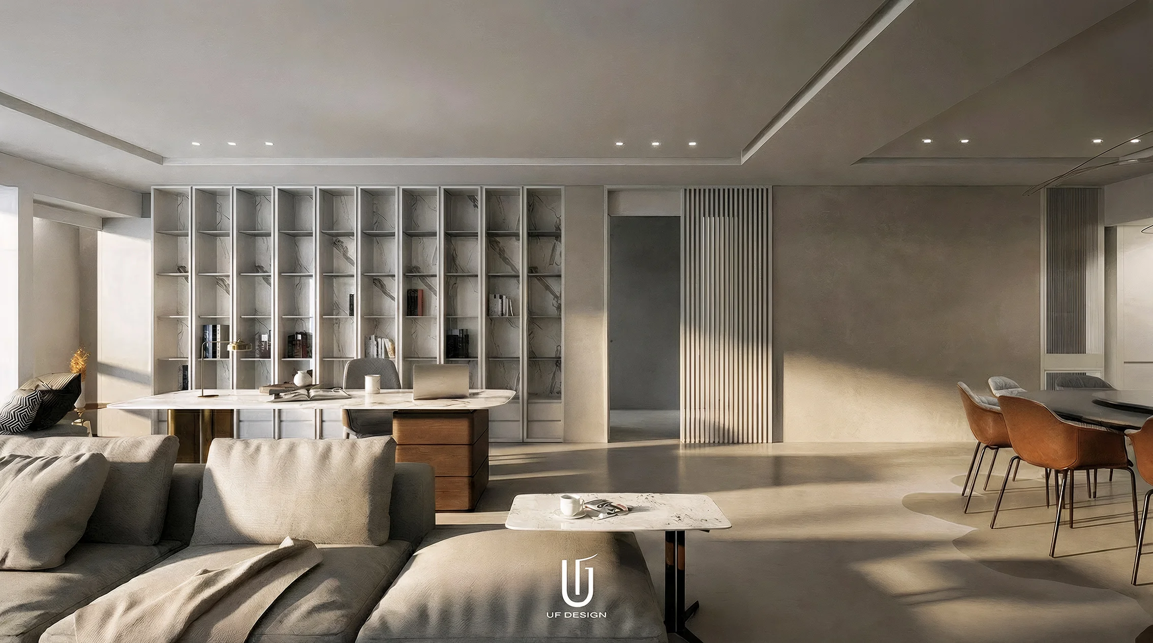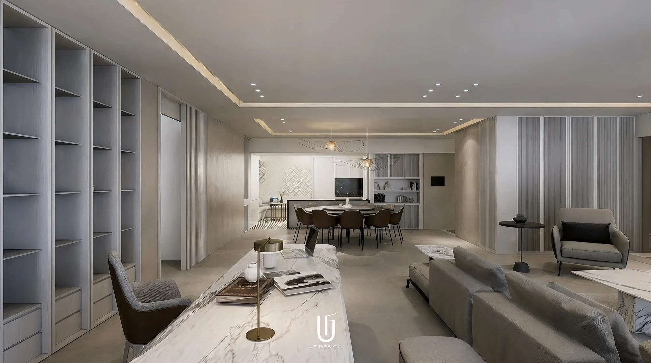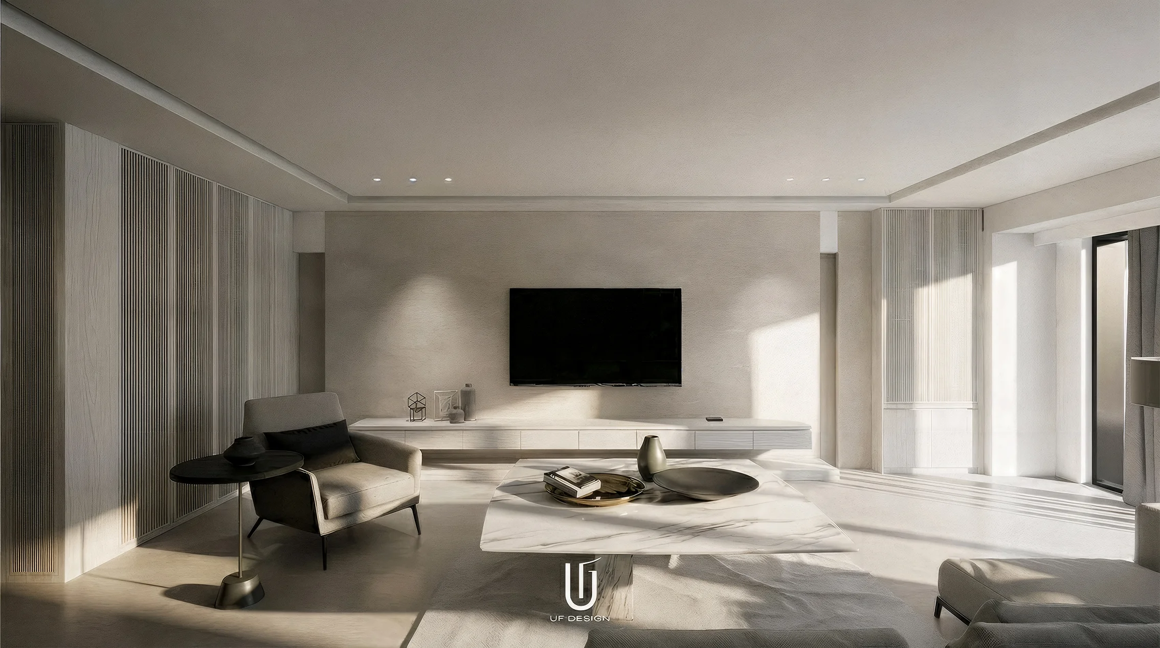 此案位於大直的住宅區域,有著大尺度的室內空間,有別於裝飾空間的想法反而讓室內化繁為簡,去除不必要的裝飾元素,將空間大面積的留白,所有的空間元素簡化,只留下生活實際上必要使用的櫃體,簡約而純粹。