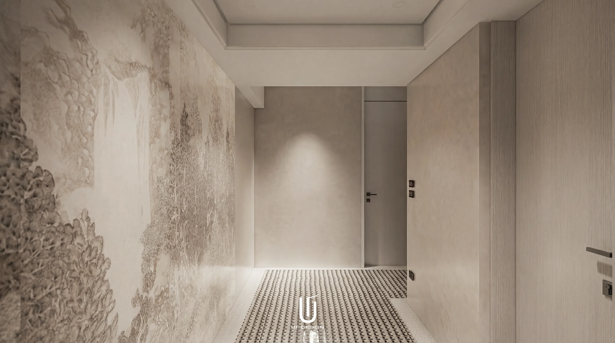 入口玄關牆面布置山水意象的壁紙,搭配獨特的幾何花磚帶出獨特的氛圍,室內運用清水模藝術漆與白色木紋質感架構出空間主調,灰白是整體空間的主要基調,搭配白色系大理石檯面,回到家就像回到自己的白色山谷之間。